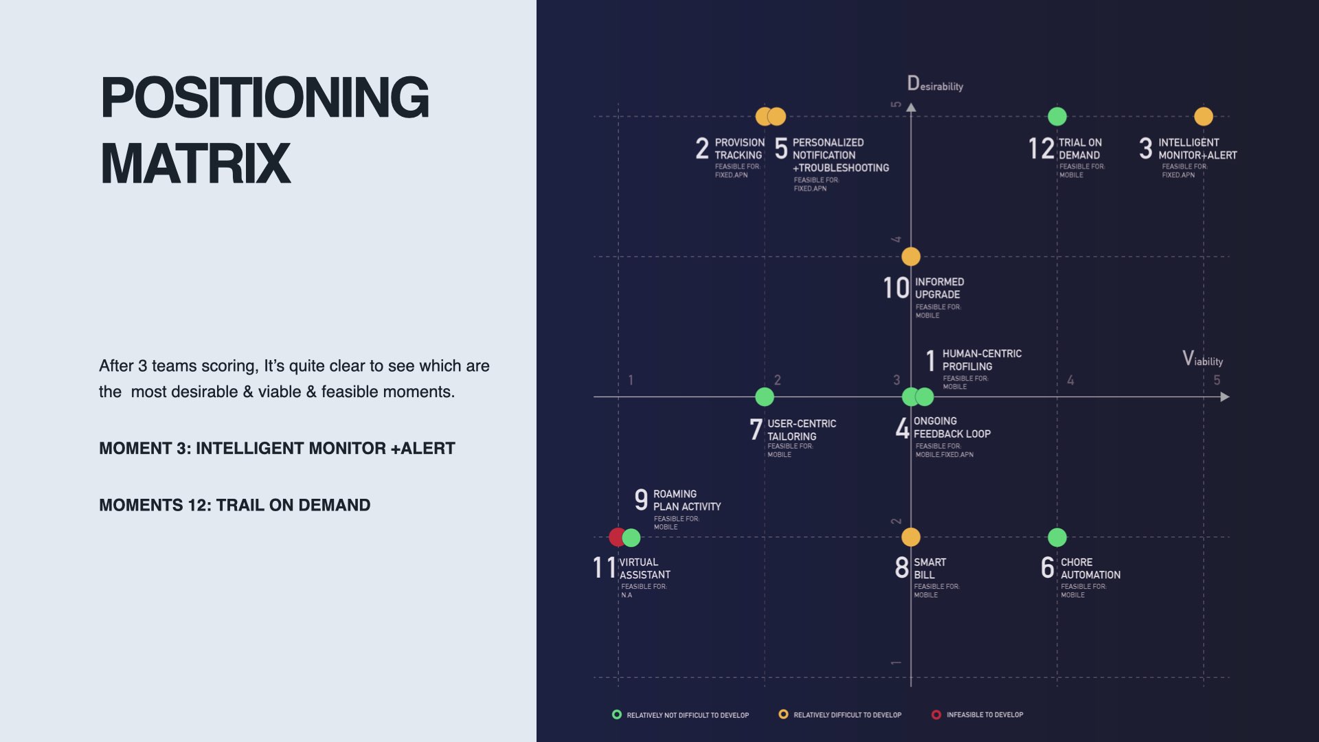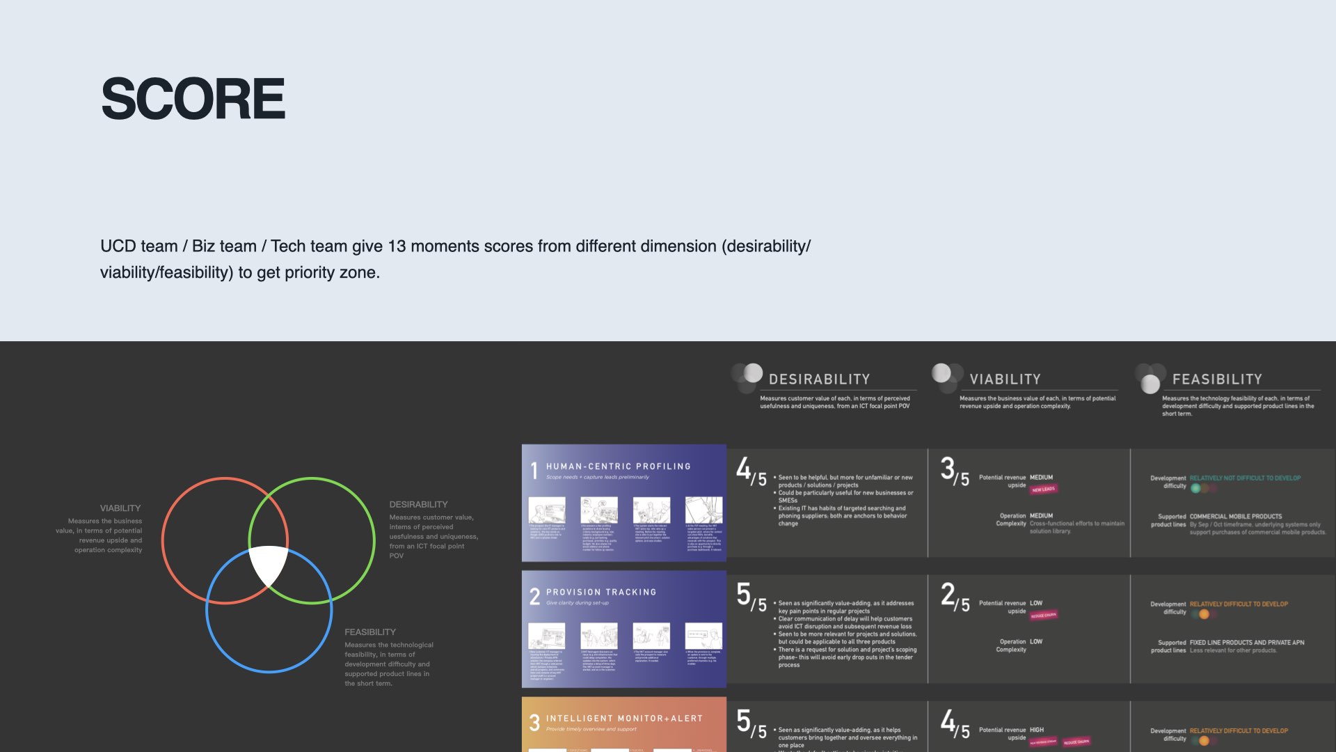 Twelve moments. Limited resources. Three teams — UCD, Business, Technology — each scoring every moment across Desirability, Viability, and Feasibility.