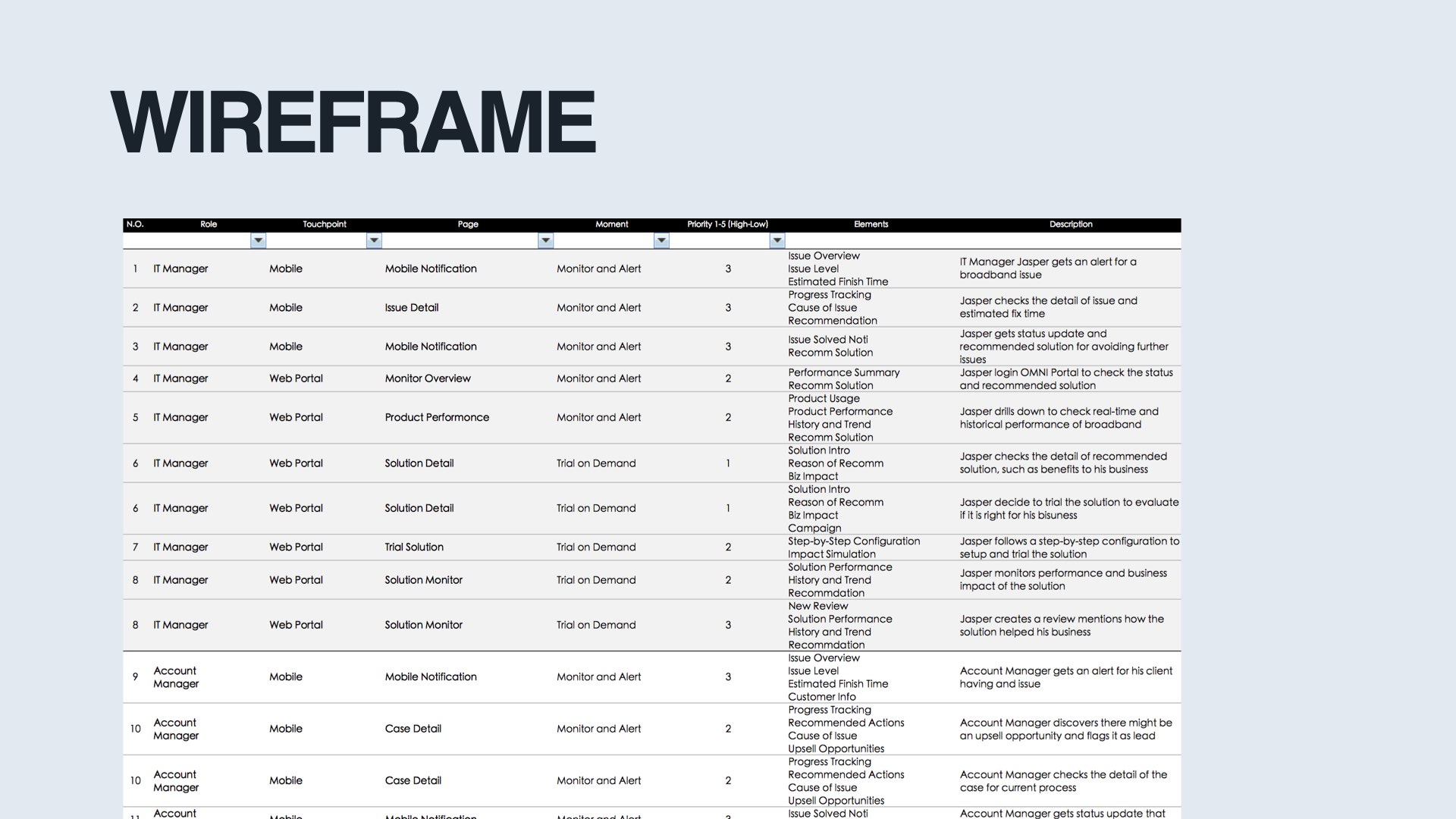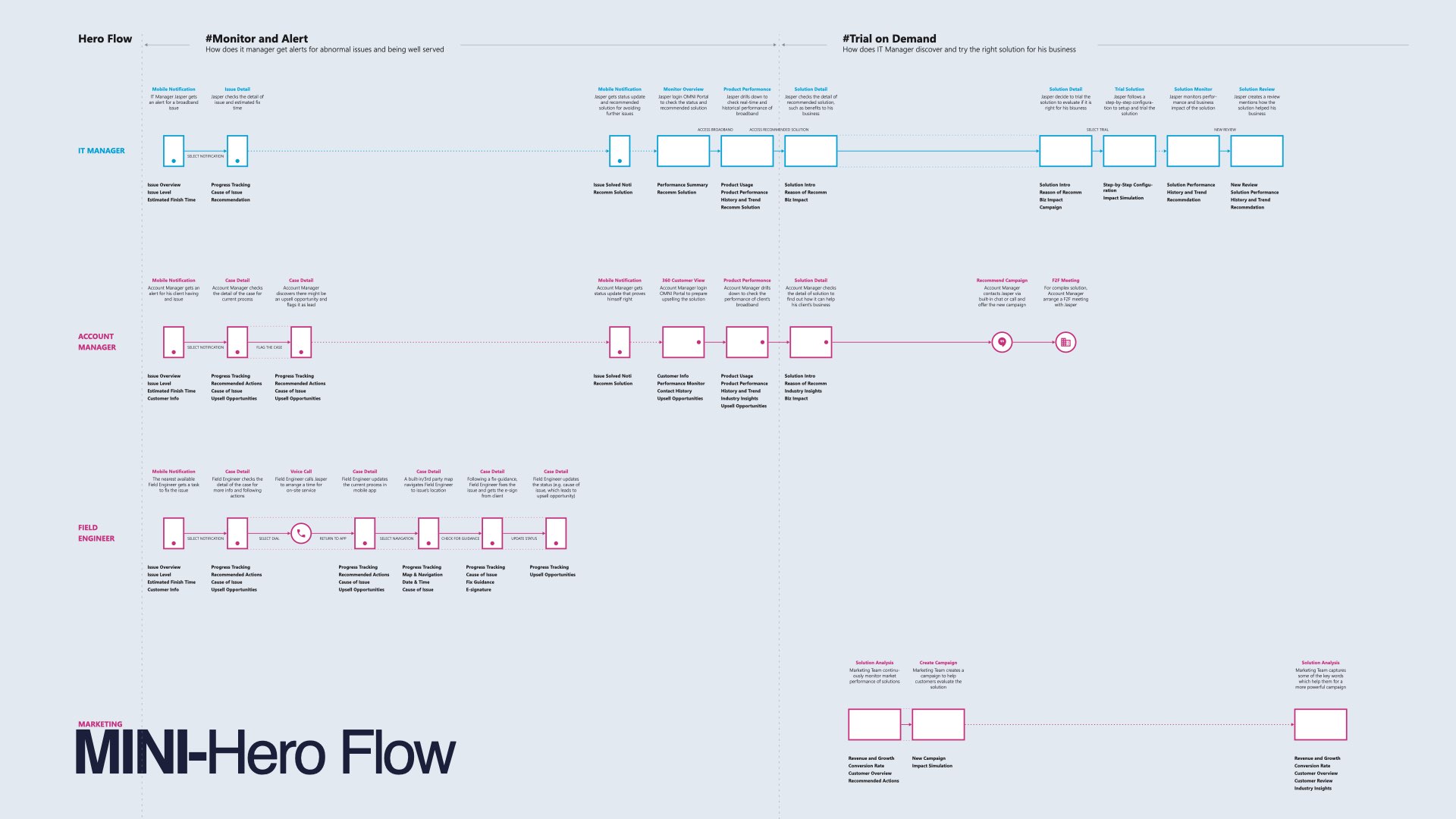 Storyboards brought the service to life — showing how account managers, IT managers, field engineers, and customers would experience the new platform together.